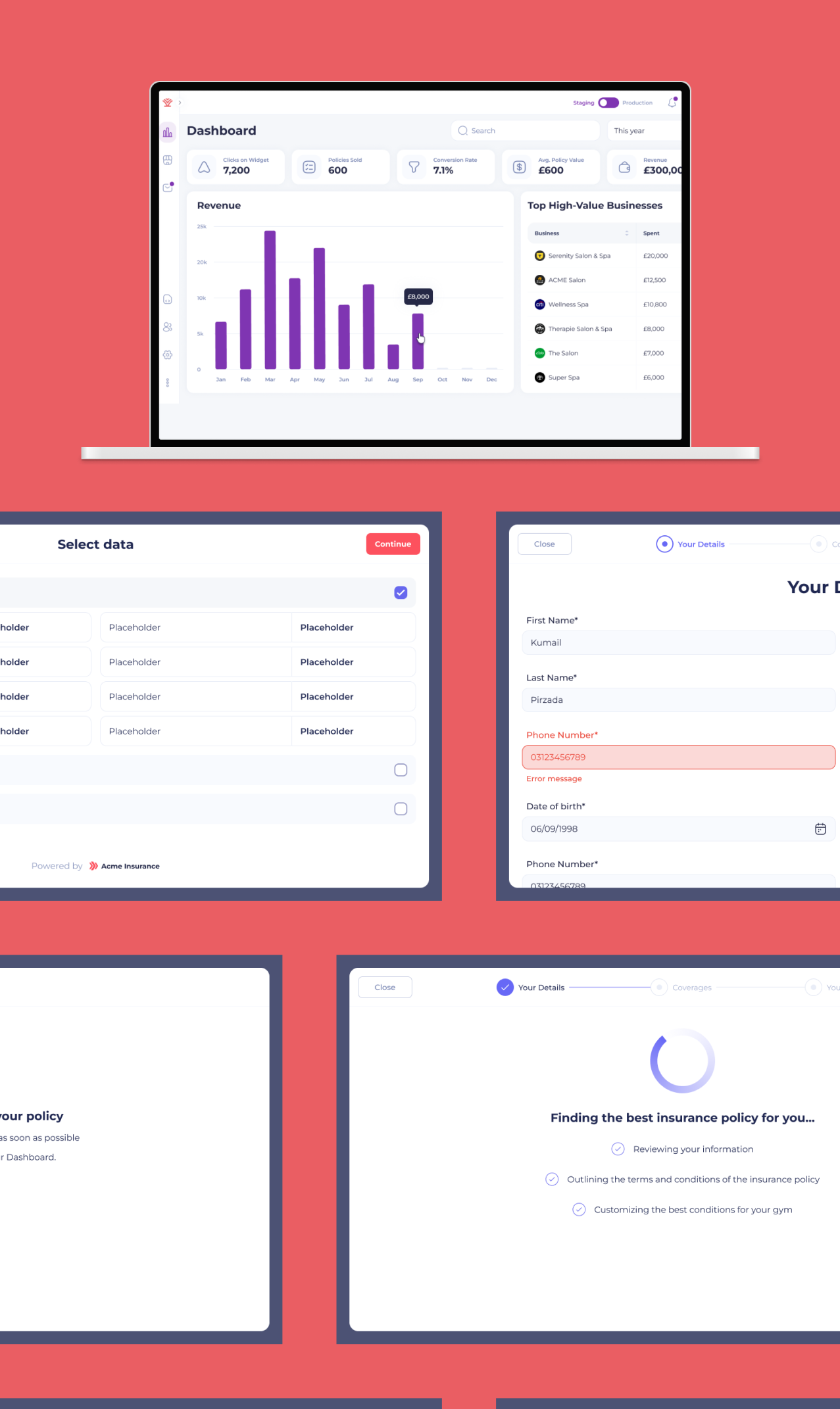 Kayna is an embedded insurance platform that connects carriers, brokers, and businesses to deliver tailored, data-driven insurance solutions with seamless quoting, renewals, and claims. We built their core system end-to-end—including a lightweight embeddable React widget, a centralized dashboard for managing policies and claims, a scalable backend for real-time performance, and intuitive UX/UI that simplifies complex workflows—empowering Kayna to offer a smarter, more efficient insurance experience that elevates how businesses serve their customers.